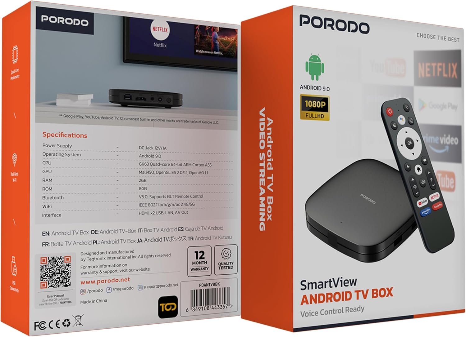 The Porodo Android TV Box offers 1080P resolution with Bluetooth V5.0 and a BLT remote. It includes HDMI, 2 USB ports, LAN, and AV Out for easy device connections. Powered by Android 9.0, with 2GB RAM and 8GB ROM, it ensures smooth performance and ample storage for all your entertainment needs.